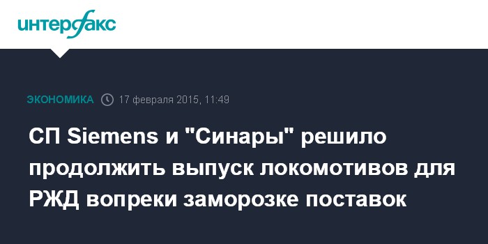 Москва. 17 февраля. INTERFAX.RU – Совместное предприятие немецкого концерна Siemens и российской группы "Синара" Дмитрия Пумпянского продолжают производство локомотивов для РЖД, несмотря на заморозку поставок.