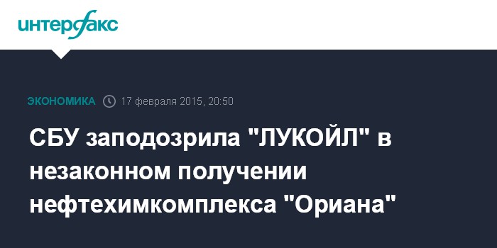 Москва. 17 февраля. INTERFAX.RU - Служба безопасности Украины сообщает о раскрытии "противоправной сделки", в результате которой российская компания "ЛУКОЙЛ" получила в собственность нефтехимический комплекс ОАО "Ориана" и нанесла многомиллионные убытки государственному бюджету.