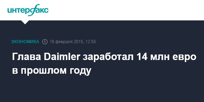 Москва. 18 февраля. INTERFAX.RU – Глава германского автоконцерна Daimler Дитер Цетше в 2014 году получил вознаграждение в размере 14,4 млн евро против 13,7 млн годом ранее, свидетельствуют данные, обнародованные Daimler согласно новым правилам раскрытия информации. Это второй по величине результатом среди топ-менеджеров Германии.