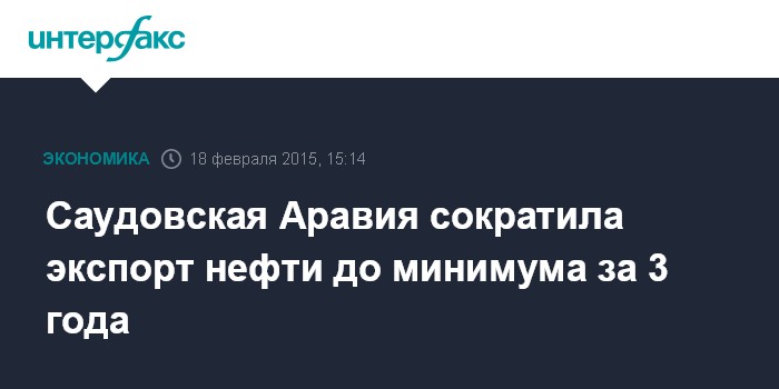 Москва. 18 февраля. INTERFAX.RU – Саудовская Аравия сократила экспорт нефти в 2014 году на 5,7%, до в среднем 7,11 млн баррелей в сутки (б/с), или минимума с 2011 года, свидетельствуют данные Совместной инициативы по нефтяной статистике (Joint Organisations Data Initiative, JODI).