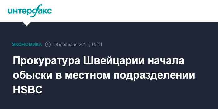 Москва. 18 февраля. INTERFAX.RU – Прокуратура Швейцарии проводит обыски в местном подразделении британского банковского холдинга HSBC в рамках дела о содействии зарубежным клиентам в уходе от налогов, пишет The Financial Times.
