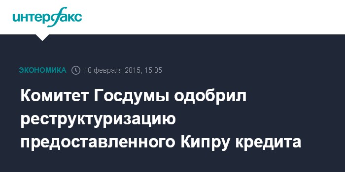 Москва. 18 февраля. INTERFAX.RU – Комитет Госдумы по бюджету и налогам на заседании в среду рекомендовал ратифицировать протокол о реструктуризации долга Кипра. Документ, внесенный российским правительством, предлагает снизить процентную ставку по кредиту до 2,5% и перенести срок погашения задолженности на 2018-2021 годы.