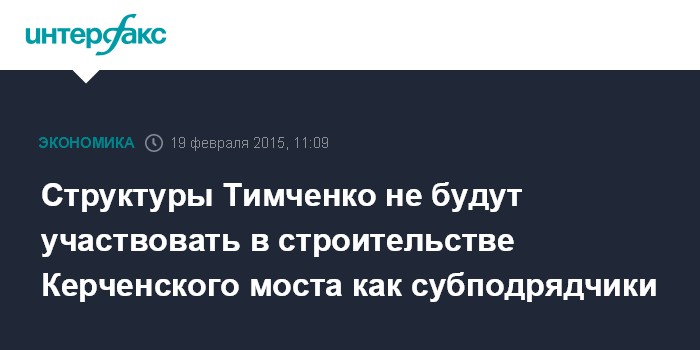 Москва. 19 февраля. INTERFAX.RU – Компании Геннадия Тимченко не будут претендовать на субподряды в рамках строительства транспортного перехода через Керченский мост, госконтракт на которое получил "Стройгазмонтаж" Аркадия Ротенберга.