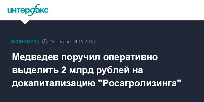 Москва. 19 февраля. INTERFAX.RU – Премьер-министр России Дмитрий Медведев на заседании правительства в четверг поручил выделить 2 млрд рублей на увеличение уставного капитала ОАО "Росагролизинг".