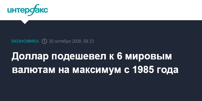 Нью-Йорк (ООН). 30 октября. INTERFAX.RU - Курс американского доллара в среду опустился по отношению к шести нацвалютам стран, которые являются основными торговыми партнерами США, на максимальную величину с 1985 года, сообщило агентство Bloomberg.