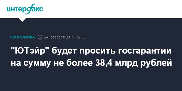 Ранее в материалах к совещанию у вице-премьера РФ Аркадия Дворковича фигурировала информация о потребности "ЮТэйра" в госгарантиях в объеме 13,5 млрд руб. Эта цифра - оценка одного из крупных кредиторов. При этом сам перевозчик, по данным источников "Интерфакса", просил гарантии на 40 млрд руб.