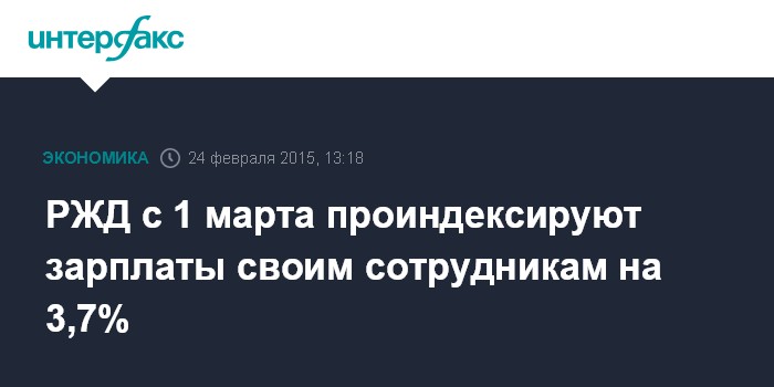 "В соответствии с коллективным договором РЖД на 2014-2016 гг., заработная плата работников компании будет проиндексирована с 1 марта на 3,7%. Предыдущая индексация была проведена 1 октября 2014 г. - на 2,63%", - говорится в сообщении монополии.