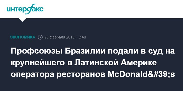 Москва. 25 февраля. INTERFAX.RU – Бразильские профсоюзы подали в суд на компанию Arcos Dorados Holdings, являющуюся крупнейшим оператором ресторанов McDonald's в Латинской Америке, в связи с нарушениями трудового законодательства.
