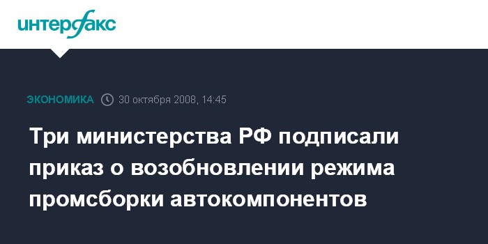 Москва. 30 октября. INTERFAX.RU - Совместный приказ Минэкономразвития России, Минпромторга России и Минфина России о возобновлении режима промышленной сборки для производителей автокомпонентов подписан главами 3 министерств, сообщает пресс-служба Минэкономразвития.
