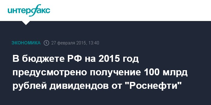 Москва. 27 февраля. INTERFAX.RU - В бюджете РФ на 2015 год предусмотрено получение 100 млрд рублей дивидендов от "Роснефти", заявила заместитель министра финансов Татьяна Нестеренко журналистам в пятницу.
