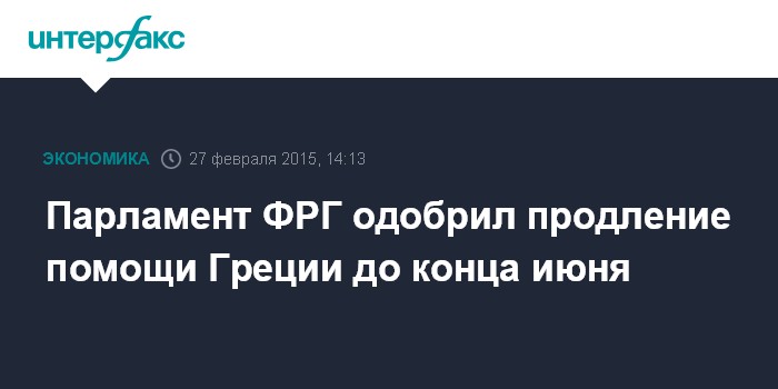 Москва. 27 февраля. INTERFAX.RU - Депутаты Бундестага в пятницу одобрили продление срока программы финансовой помощи Греции до конца июня текущего года подавляющим большинством голосов.