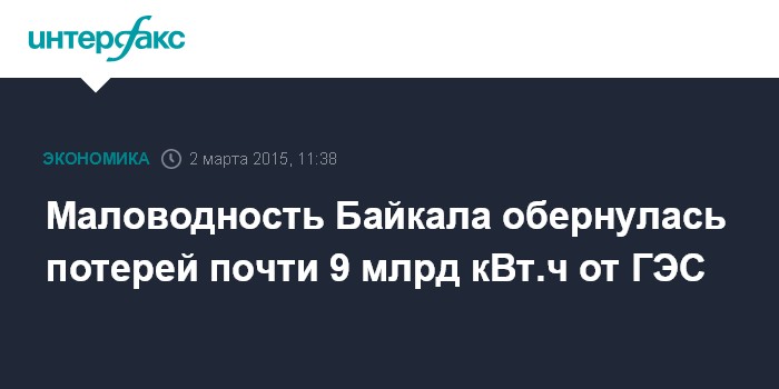 Москва. 2 марта. INTERFAX.RU – Снижение уровня воды в Байкальском бассейне привело к уменьшению выработки гидроэлектростанций примерно на 9 млрд кВт.ч, сообщил министр энергетики Александр Новак на встрече с президентом Владимиром Путиным.
