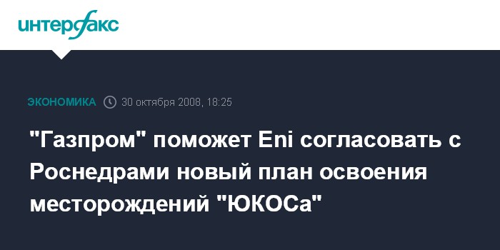 Москва. 30 октября. INTERFAX.RU - "Газпром" обещает помочь Eni согласовать с Роснедрами новый план освоения месторождений, ранее принадлежавших "ЮКОСу", говорится в сообщении российской компании.