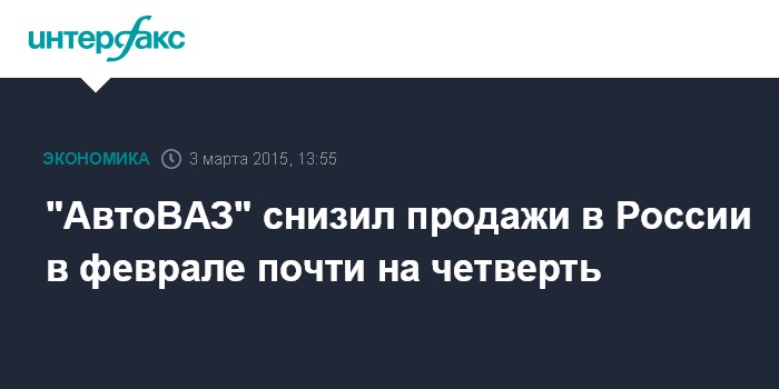 Москва. 3 марта. INTERFAX.RU – "АвтоВАЗ" в феврале текущего года продал в России 23,639 тыс. автомобилей, что на 23,5% меньше, чем в феврале 2014 года, сообщил вице-президент по продажам и маркетингу компании Денис Петрунин журналистам во вторник.