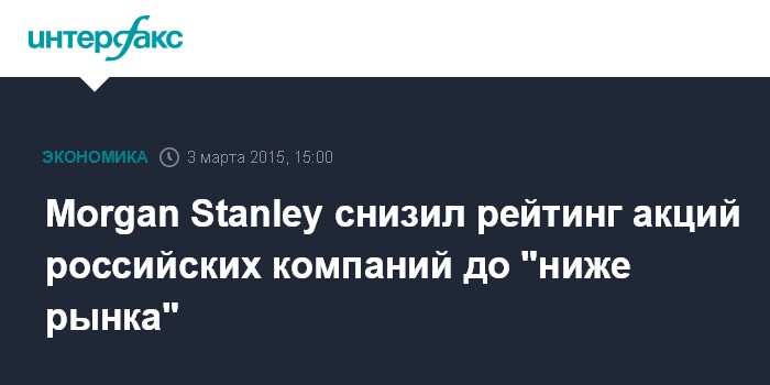 Москва. 3 марта. INTERFAX.RU – Morgan Stanley понизил рейтинг акций российских компаний до "ниже рынка" в связи с ростом риска относительно ожидаемой доходности при инвестировании в данный вид активов после недавнего ралли на фондовом рынке России, сообщается в обзоре инвестбанка.
