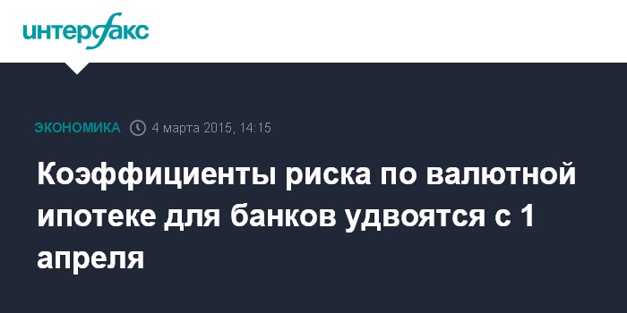 Москва. 4 марта. INTERFAX.RU – ЦБ РФ повысил коэффициенты риска при расчете достаточности капитала до 300% с 150% для валютной ипотеки, выданной после 1 апреля 2015 года.
