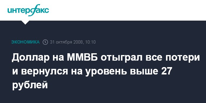 Москва. 31 октября. INTERFAX.RU - Доллар утром в пятницу взлетел, отвоевав все потери, понесенные в ходе стремительного падения на ММВБ накануне. Торги на сессии расчетами "завтра" открылись около уровня 27,1 руб./$1, на 32 коп. выше уровня закрытия предыдущего дня и на 56 коп. выше официального курса ЦБ РФ.
