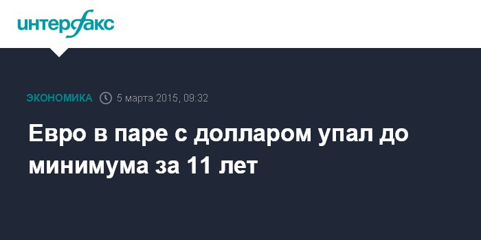 Москва. 5 марта. INTERFAX.RU – Евро в ходе торгов в четверг упал до минимума с сентября 2003 года в паре с долларом в ожидании заседания Европейского центрального банка и запуска программы количественного смягчения (QE) в еврозоне, сообщает агентство Bloomberg.