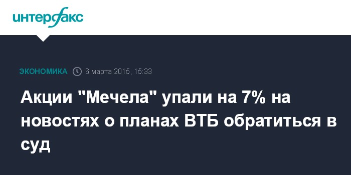 Москва. 6 марта. INTERFAX.RU – Акции "Мечела" днем в пятницу упали более чем на 7% на новостях о том, что ВТБ намерен в ближайшие дни обратиться в суд с заявлением о признании "Мечела" банкротом. На Московской бирже к 15:25 мск акции "Мечела" подешевели до 86,74 рубля (-7,2%), привилегированные бумаги просели до 60,74 рубля (-4,9%).
