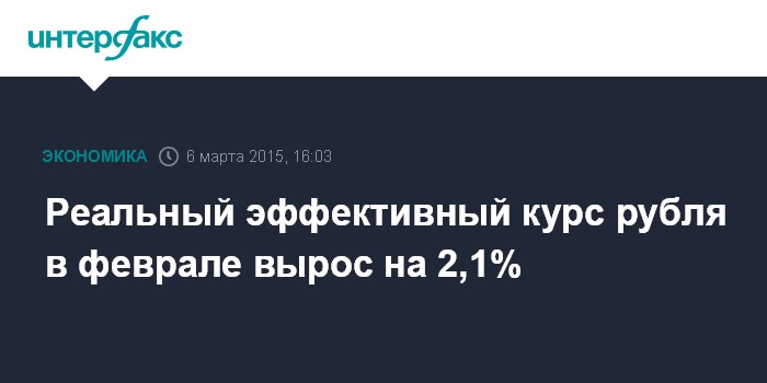 Москва. 6 марта. INTERFAX.RU – Реальный эффективный курс рубля к корзине валют государств - основных торговых партнеров России в феврале 2015 года вырос на 2,1% по отношению к январю, согласно предварительной оценке ЦБ РФ, опубликованной на его сайте.