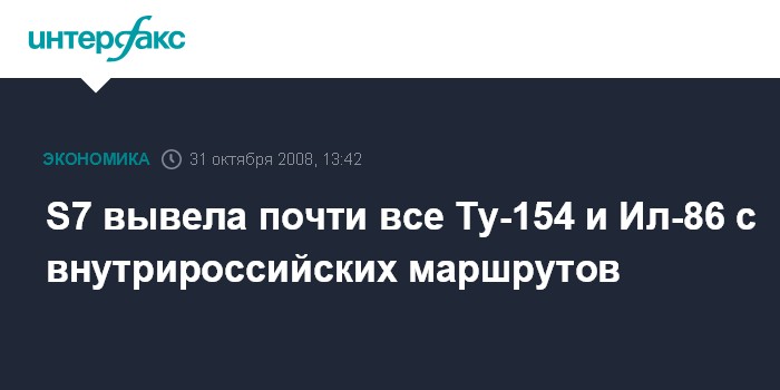 Москва. 31 октября. INTERFAX.RU - Авиакомпания "Сибирь" (торговая марка S7) вывела почти все самолеты российского производства Ту-154 и Ил-86 с внутрироссийских маршрутов, заменив их на иностранные лайнеры, говорится в сообщении компании.
