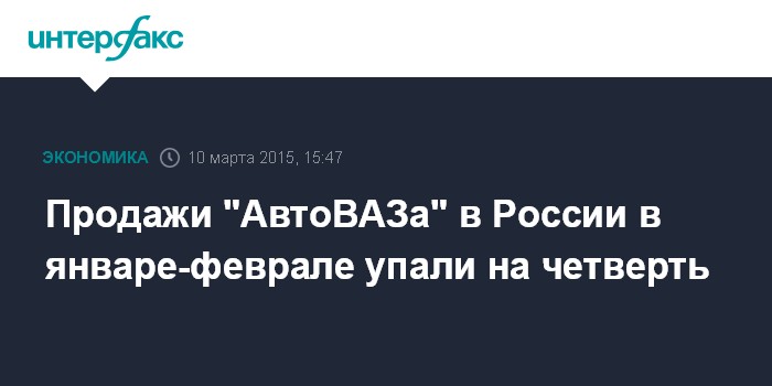 Москва. 10 марта. INTERFAX.RU – "АвтоВАЗ" снизил продажи автомобилей Ladaв России в феврале 2015 года на 23%, до 23,639 тыс. автомобилей, говорится в сообщении Ассоциации европейского бизнеса.