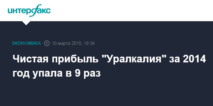 Москва. 10 марта. INTERFAX.RU – Чистая прибыль "Уралкалия" по российским стандартам (РСБУ) за 2014 год упала в 9 раз - до 3,465 млрд рублей с 31,324 млрд рублей за 2013, говорится в отчете компании.