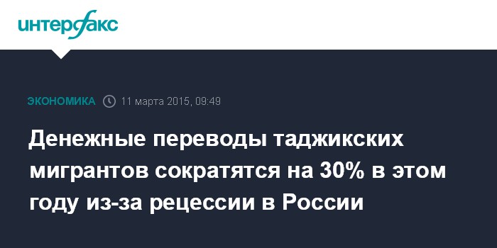 Москва. 11 марта. INTERFAX.RU – Объем денежных переводов таджикских трудовых мигрантов на родину по итогам 2015 года может уменьшиться на 30% в долларовом выражении, прогнозирует Международный валютный фонд.