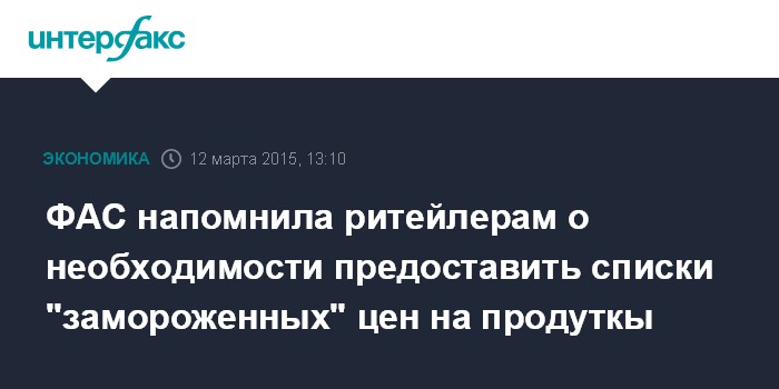 Москва. 12 марта. INTERFAX.RU – ФАС рассчитывает в течение следующей недели получить от продуктовых ритейлеров списки товаров, на которые были заморожены цены, сообщил журналистам начальник управления контроля социальной сферой и торговли ФАС Тимофей Нижегородцев.