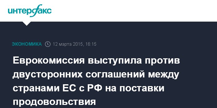 Москва. 12 марта. INTERFAX.RU – Европейская комиссия будет стараться не допускать, чтобы отдельные страны ЕС заключали двусторонние соглашения с Россией на экспорт продовольствия. Как сообщает агентство BNS, об этом говорится в ответе Еврокомиссии на запрос литовского европарламентария Брониса Ропе.