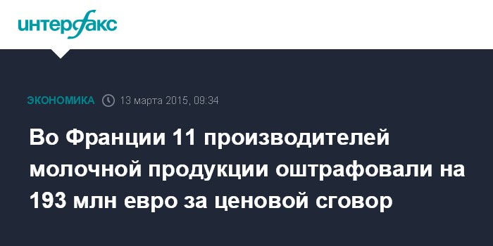 Москва. 13 марта. INTERFAX.RU – Французский антимонопольный орган Autorite de la Concurrence оштрафовал ряд производителей свежей молочной продукции на 193 млн евро за картельный сговор, пишет The Wall Street Journal.