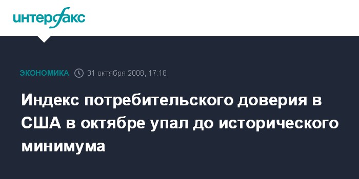 Москва. 31 октября. INTERFAX.RU - Индекс доверия потребителей в США, рассчитываемый экономистами Мичиганского университета, в октябре упал до исторического минимума, сообщило агентство Bloomberg.