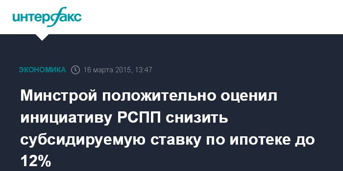 Москва. 16 марта. INTERFAX.RU – Минстрой положительно оценивает инициативу Российского союза промышленников и предпринимателей (РСПП) о снижении субсидируемой ставки по ипотеке с 13% до 12%, сообщил глава Минстроя Михаил Мень журналистам.
