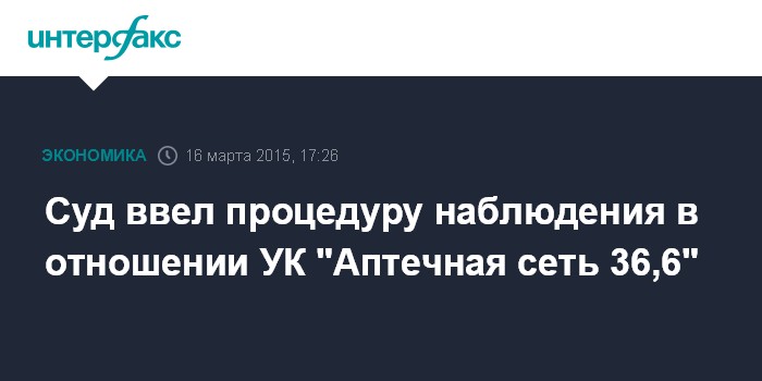 Москва. 16 марта. INTERFAX.RU – Арбитражный суд Москвы принял решение ввести процедуру наблюдения в отношении ЗАО "Управляющая компания "Аптечная сеть 36,6". С таким требование в суд обратился системный интегратор ЗАО "КРОК Инкорпорейтед".