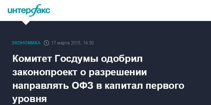 Москва. 17 марта. INTERFAX.RU – Комитет Госдумы по вопросам собственности рекомендовал нижней палате парламента принять в первом чтении законопроект, который позволяет Агентству по страхованию вкладов (АСВ) направлять облигации федерального займа (ОФЗ) в капитал первого уровня банков.