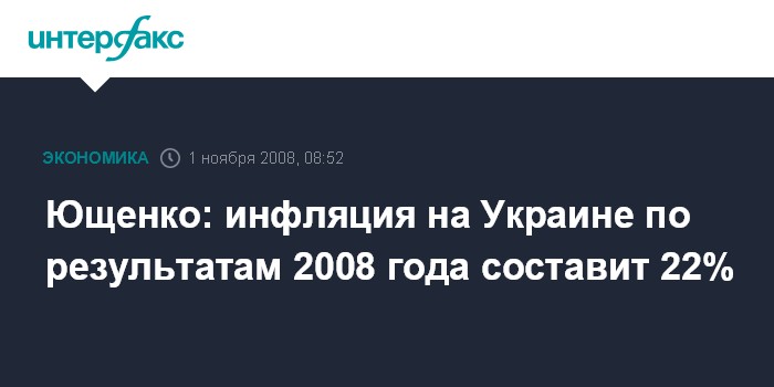 Москва. 1 ноября. INTERFAX.RU - Президент Украины Виктор Ющенко прогнозирует 22%-ную инфляцию по результатам 2008 года.