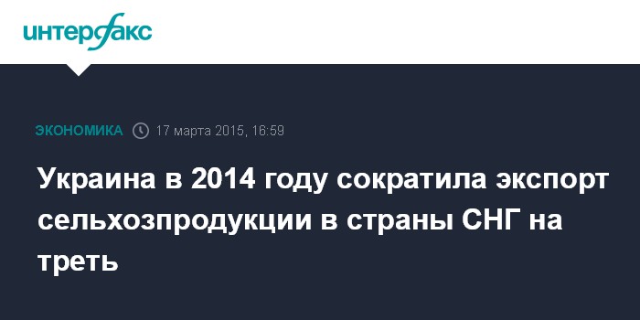 Москва. 17 марта. INTERFAX.RU - Экспорт украинской сельскохозяйственной продукции в страны СНГ за 2014 год сократился на 31,1%, сообщается в материалах Министерства аграрной политики и продовольствия Украины.