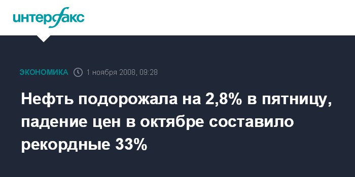 Москва. 1 ноября. INTERFAX.RU - Нефть подорожала на 2,8% в пятницу, таким образом, падение цен в целом за октябрь достигло рекордных с начала торгов в Нью-Йорке с 1983 года 33%, сообщило агентство Bloomberg.