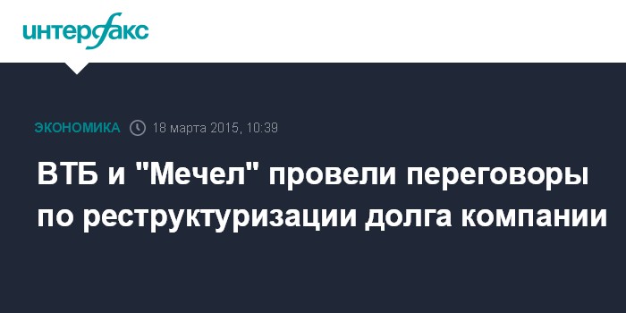 Москва. 18 марта. INTERFAX.RU – Руководство ВТБ и "Мечела" во вторник провели переговоры по реструктуризации задолженности меткомпании, сообщили "Интерфаксу" в банке.