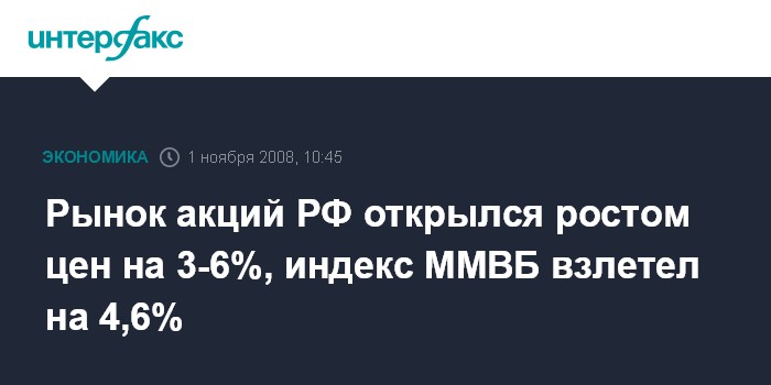 Москва. 1 ноября. INTERFAX.RU - Российский рынок акций открылся в субботу ростом цен ликвидных бумаг на 3-6%, отыгрывая позитивную динамику мировых фондовых и сырьевого рынков накануне, индекс ММВБ взлетел на 4,6%.