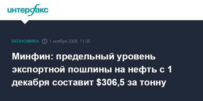 Москва. 1 ноября. INTERFAX.RU - Предельный уровень экспортной пошлины на нефть, которая должна быть установлена с 1 декабря, составит $306,5 за тонну, сообщил агентству "Интерфакс-АФИ" заместитель начальника отдела таможенных платежей Минфина РФ Александр Сакович.