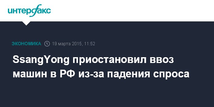 Москва. 19 марта. INTERFAX.RU - Корейский автопроизводитель SsangYong приостановил экспорт автомобилей в РФ в связи с падением спроса на автомобили, сообщил "Интерфаксу" представитель ОАО "Соллерс" (является эксклюзивным дистрибьютором SsangYong).