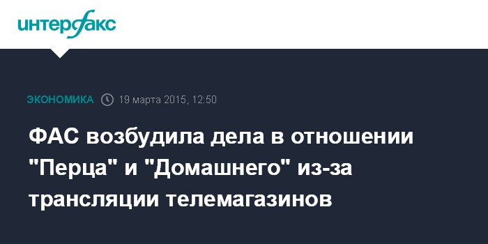 Москва. 19 марта. INTERFAX.RU – ФАС возбудила дела в отношении ЗАО "ТВ Дарьял" и ЗАО "Новый канал" (операционные компании телеканалов "Перец" и "Домашний") из-за трансляции телемагазинов.