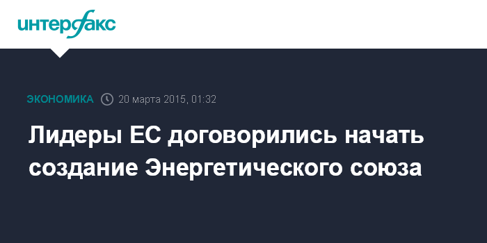 Москва. 20 марта. INTERFAX.RU - Лидеры стран ЕС договорились начать создание Энергетического союза. Об этом сообщается в постановлении ЕС, принятом в четверг вечером на саммите.