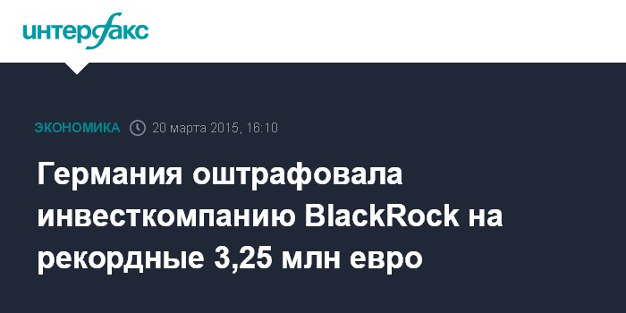Москва. 20 марта. INTERFAX.RU – Германское Федеральное управление по надзору за финансовым сектором (BaFin) в пятницу наложило на американскую инвесткомпанию BlackRock рекордный штраф в размере 3,25 млн евро в связи с указанием неправильных данных об участии BlackRock в 48 крупнейших компаниях ФРГ в течение нескольких лет, пишет The Wall Street Journal.