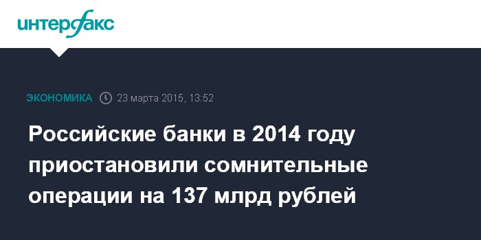 Российские банки в 2014 году приостановили сомнительные операции на 137 млрд рублей