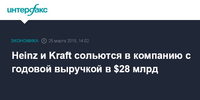 Москва. 25 марта. INTERFAX.RU – Heinz и Kraft Foods Group договорились о слиянии, в результате которого будет создан третий по величине в Северной Америке производитель продуктов питания и напитков с годовой выручкой в порядка $28 млрд, говорится в совместном пресс-релизе двух компаний.
