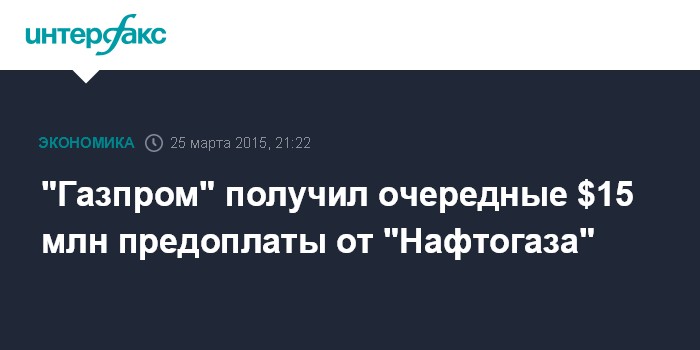 Москва. 25 марта. INTERFAX.RU - "Газпром" получил от "Нафтогаза Украины" еще $15 млн предоплаты за поставки российского газа, сообщил "Интерфаксу" официальный представитель "Газпрома" Сергей Куприянов.