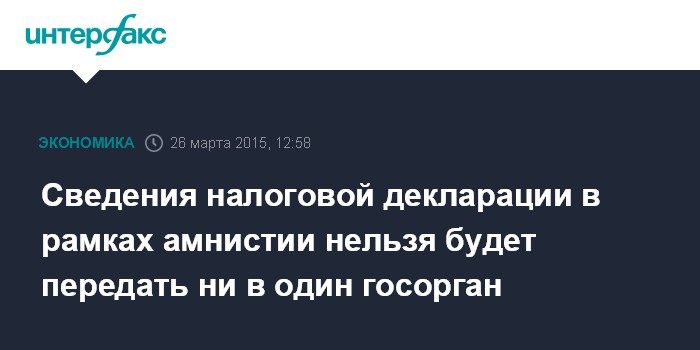 Москва. 26 марта. INTERFAX.RU – Сведения, содержащиеся в налоговой декларации, подаваемой в рамках запланированной амнистии капиталов, не смогут быть представлены ни в один государственный орган, сообщил министр финансов Антон Силуанов в четверг на заседании правительства.