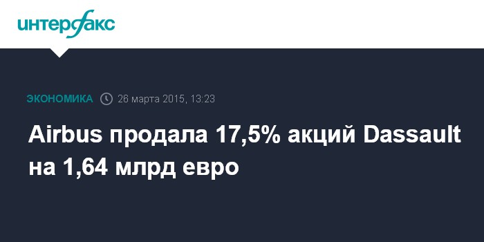 Москва. 26 марта. INTERFAX.RU – Airbus Group завершила продажу примерно 1,61 млн акций Dassault Aviation, что составляет почти 17,5% акционерного капитала компании на общую сумму около 1,64 млрд евро, говорится в пресс-релизе Airbus.